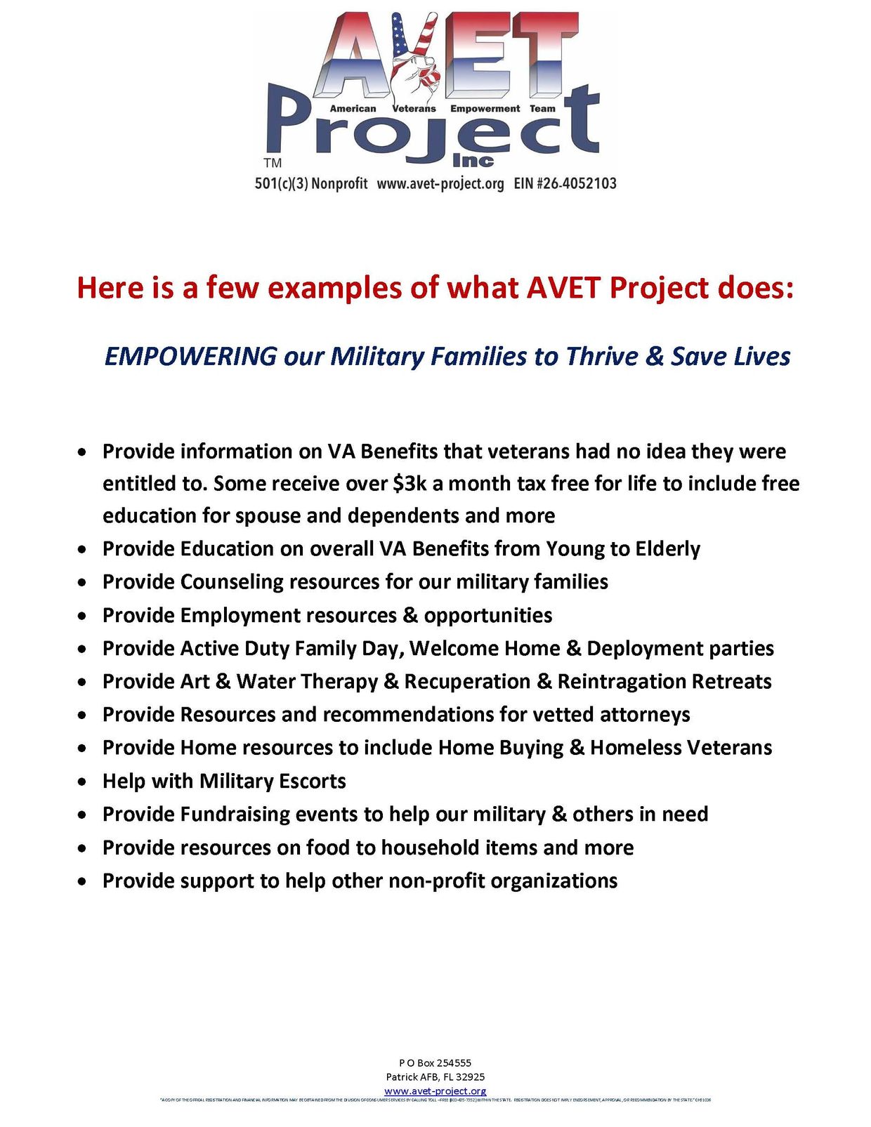 AVET Project can NOT do this alone so Thank You. Together we can help do more. Without our heroes there would be NO FREEDOM