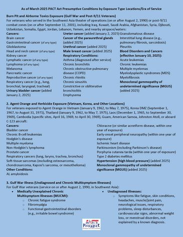 A chronic (long-lasting) illness that appears within one year after discharge, or An illness caused by contact with contaminants (toxic chemicals) or other hazardous materials, or An illness caused by your time spent as a prisoner of war (POW)