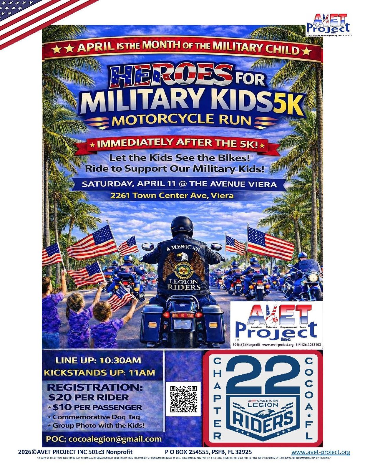 HUGE Thank YOU to ALR Post 22 for stepping up to cheer the kids and arrange a ride in support of AVET Project Heroes for Military Kids 5k/Kids Dash